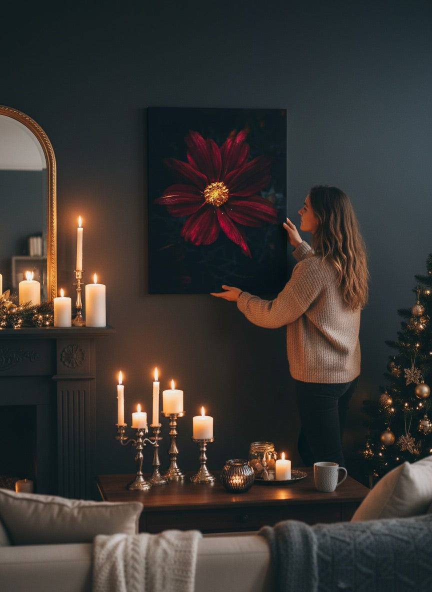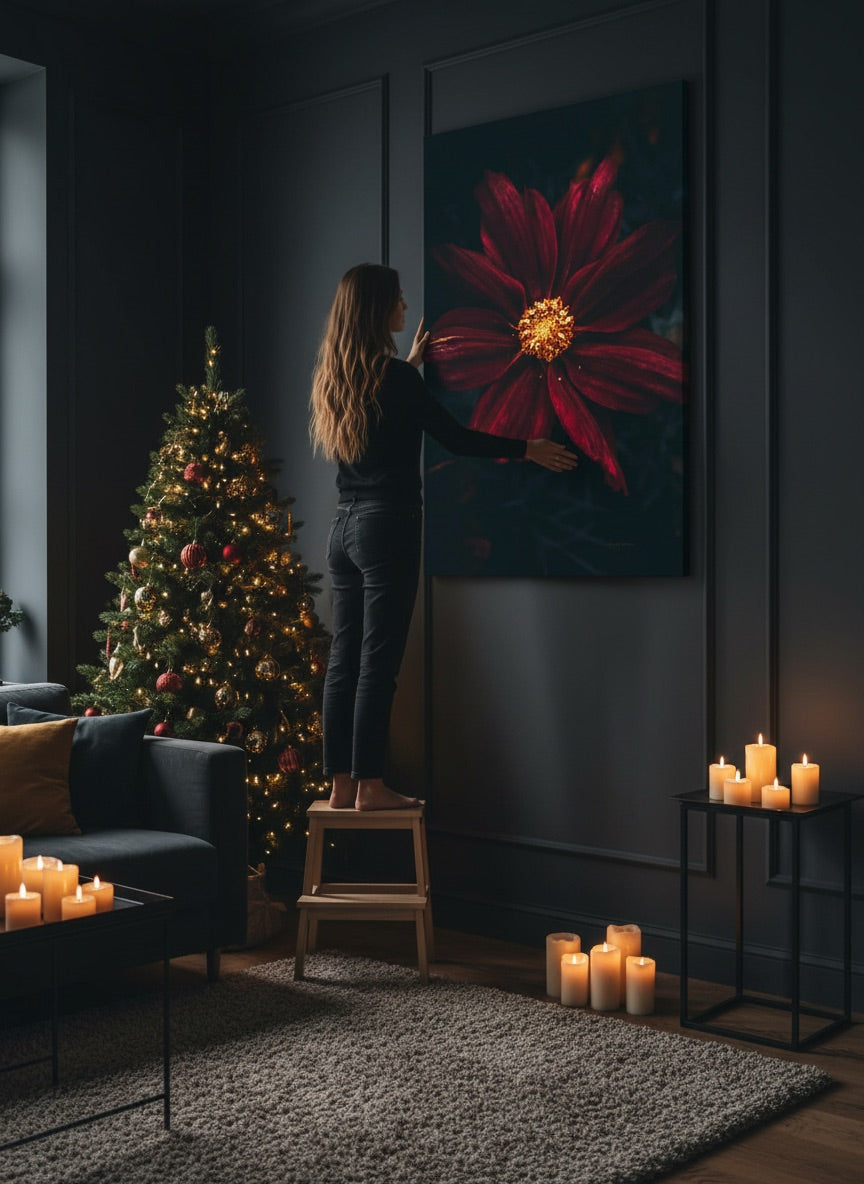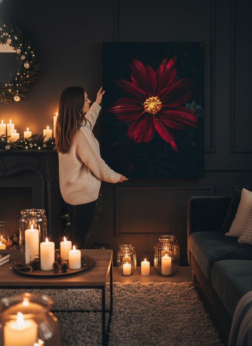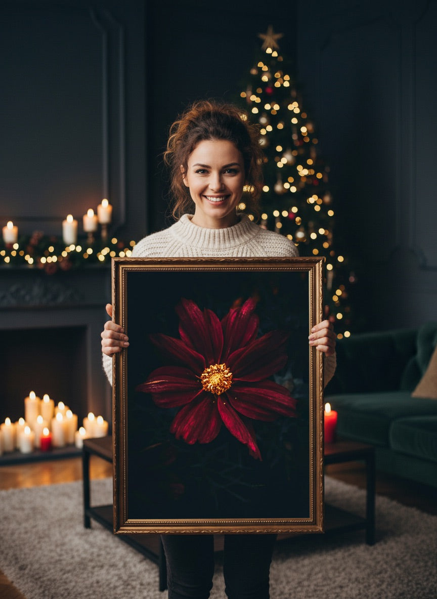 Nydelig kunstbilde av en mørkerød vakker Kosmos blomst i dype toner mot en mørk bakgrunn. Dette bildet blir et blikkfang på veggen din og vil imponere alle dine gjester, men også gi deg en skikkelig god følelse hjemme.