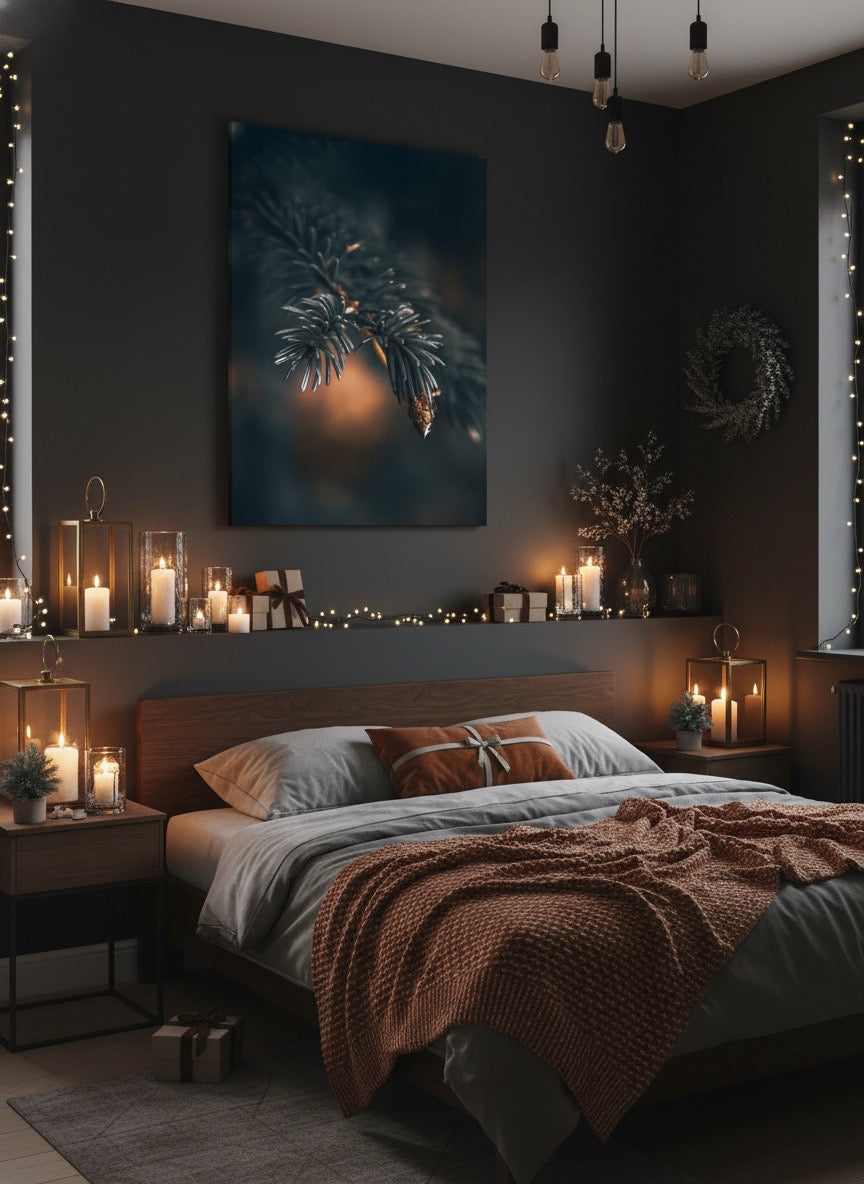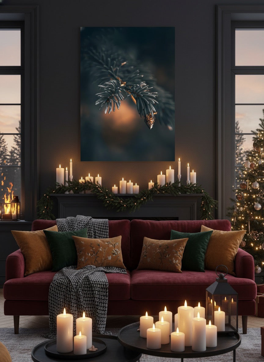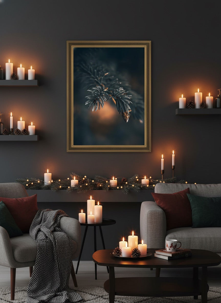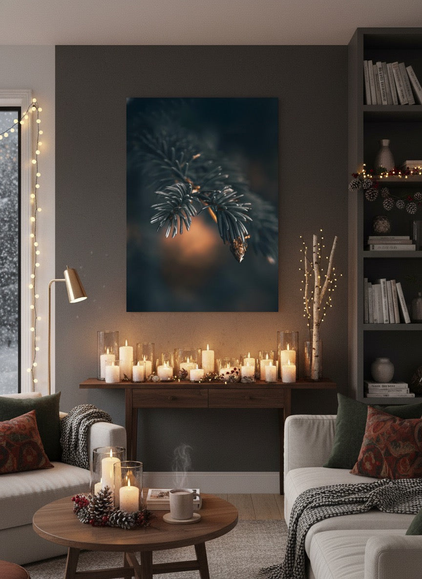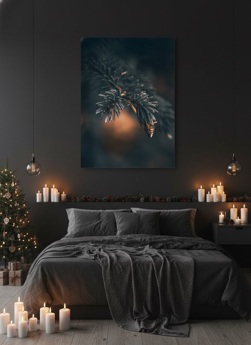 Nydelig og varmt fotografisk kunstbilde av en granbar gren i nydelige toner av blågrå med varmt gyldent lys i bakgrunnen. Få et varmende og stemningsskapende bilde på veggen du også.