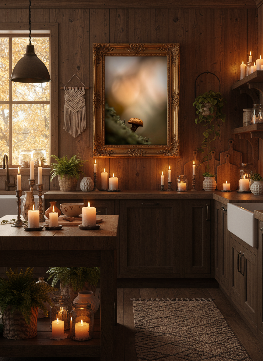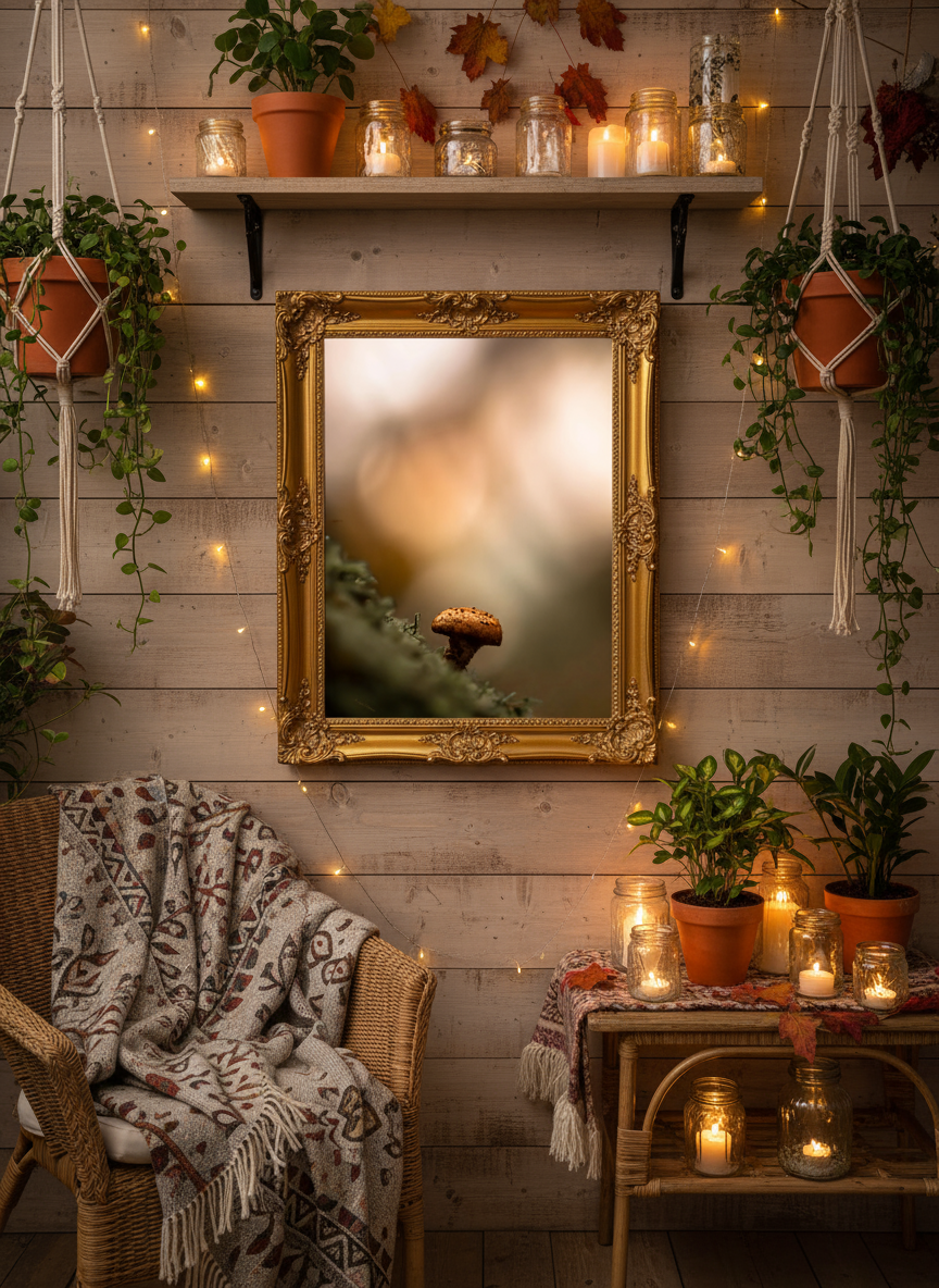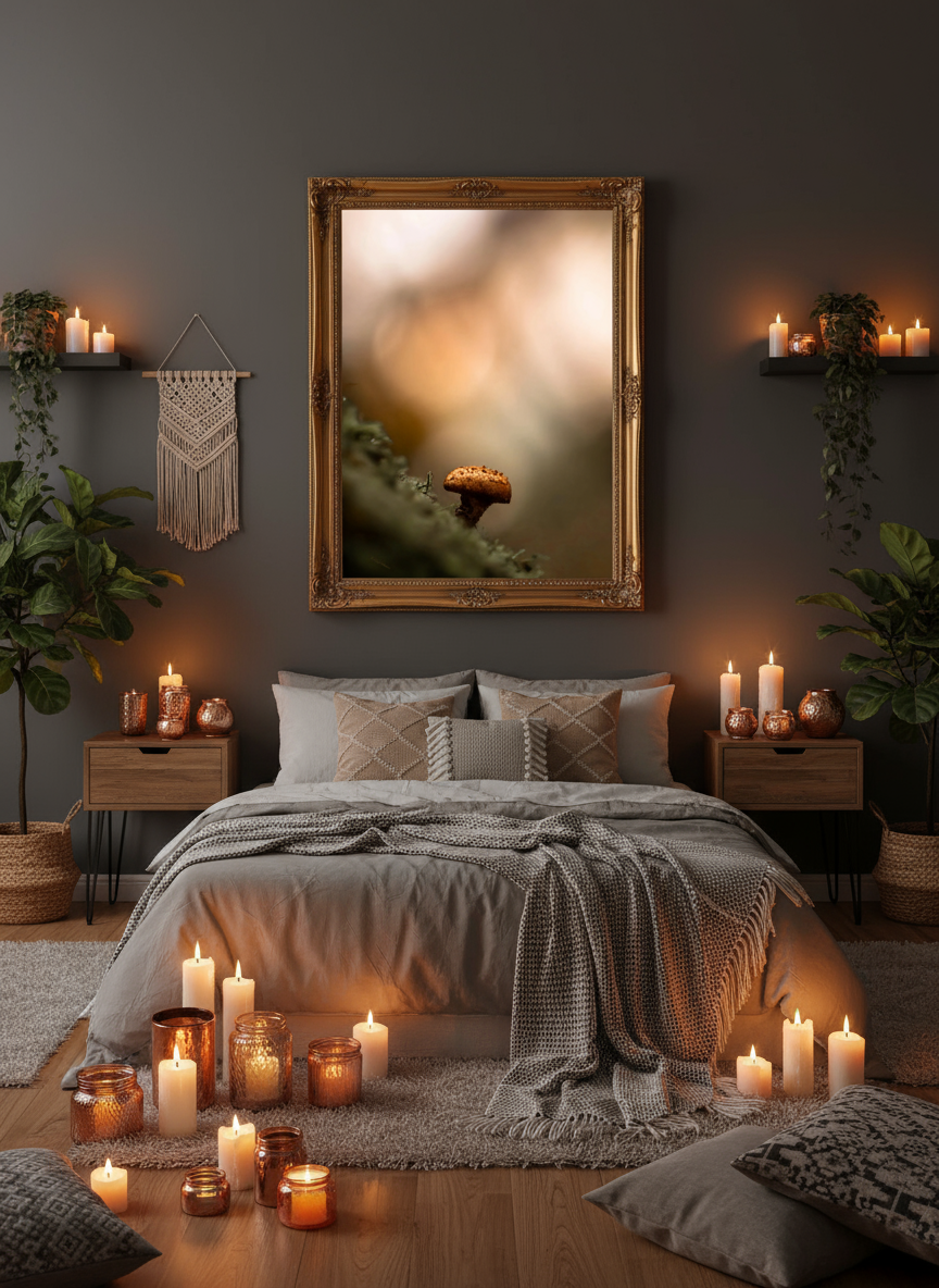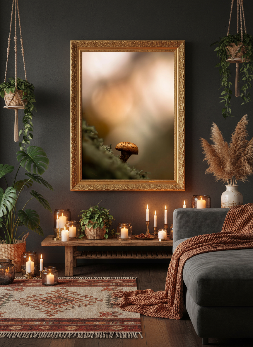 Nydelig og varmt fotografisk kunstbilde av en liten sopp på en trestamme med mose, i nydelige varme naturlige skogsfarger. Dette bildet gi deg kontakt med naturen på en helt spesiell måte. Få et varmende og stemningsskapende bilde på veggen du også.