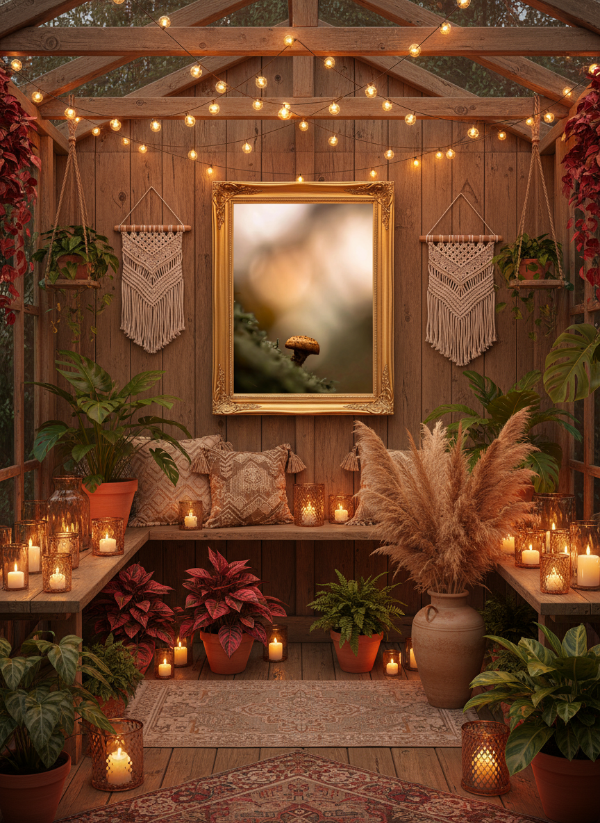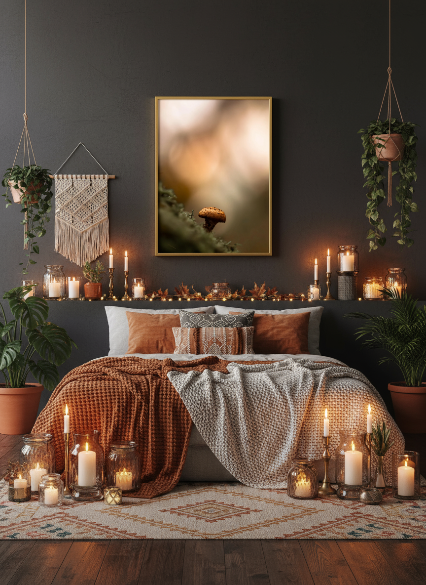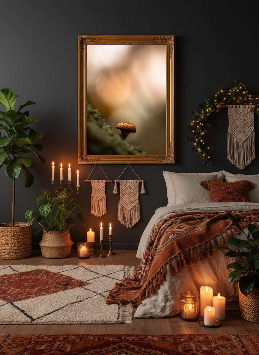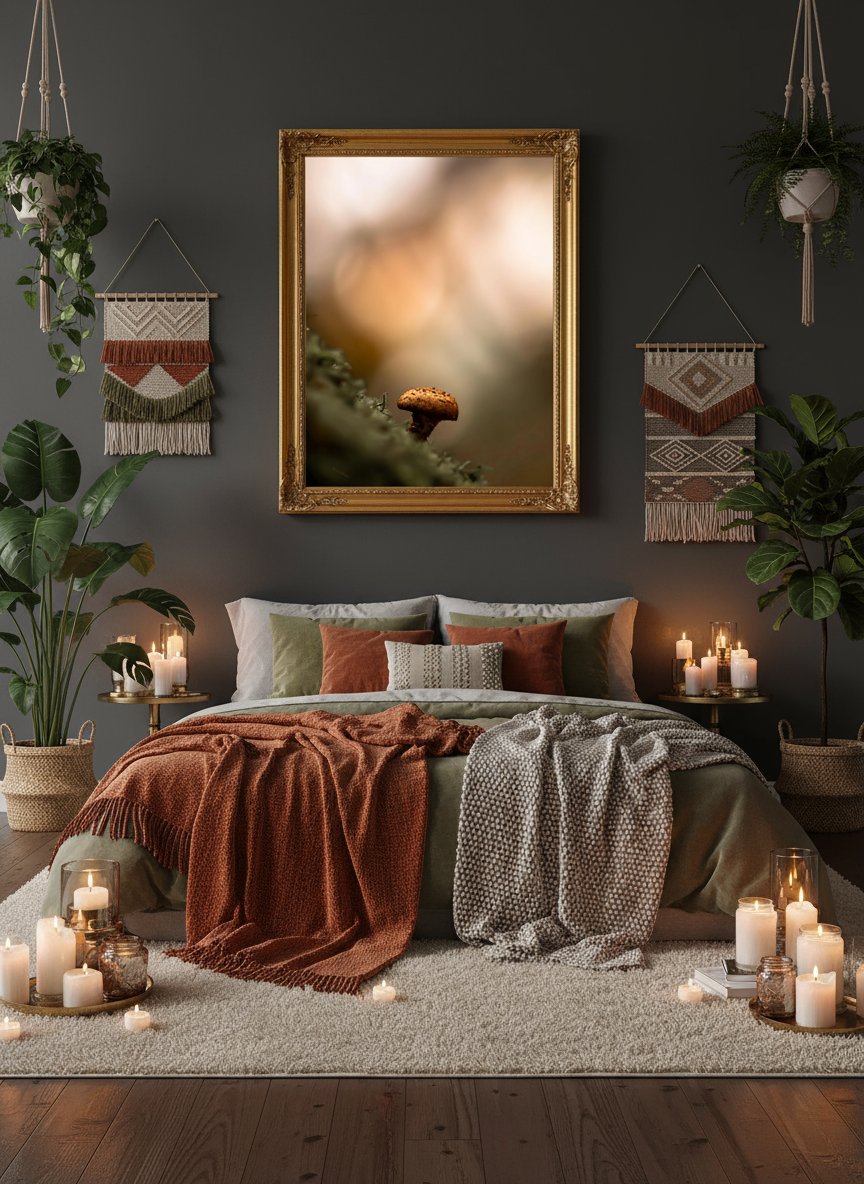 Nydelig og varmt fotografisk kunstbilde av en liten sopp på en trestamme med mose, i nydelige varme naturlige skogsfarger. Dette bildet gi deg kontakt med naturen på en helt spesiell måte. Få et varmende og stemningsskapende bilde på veggen du også.