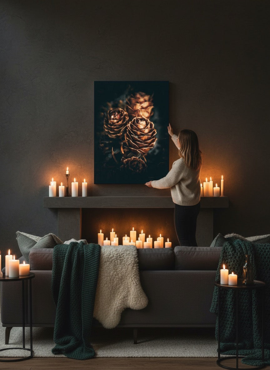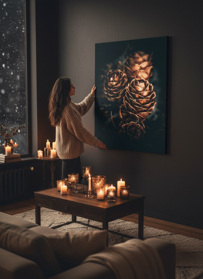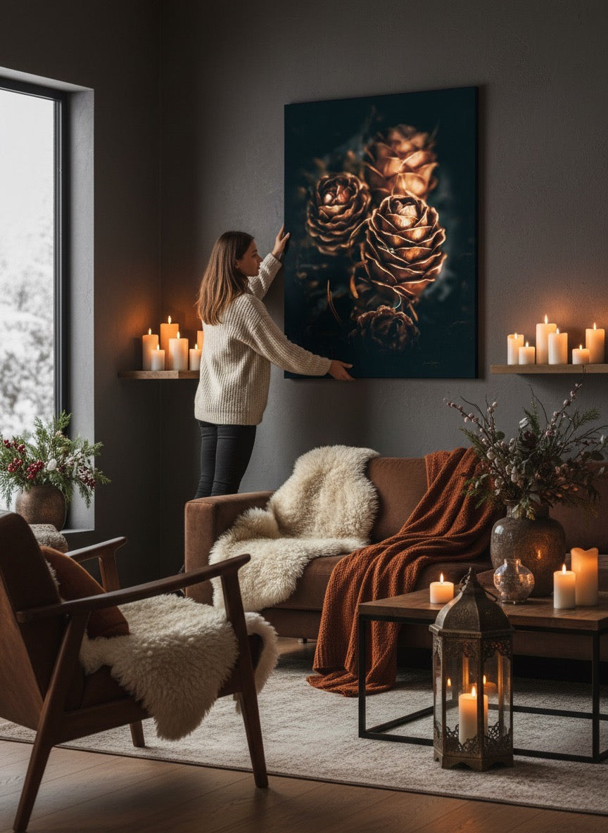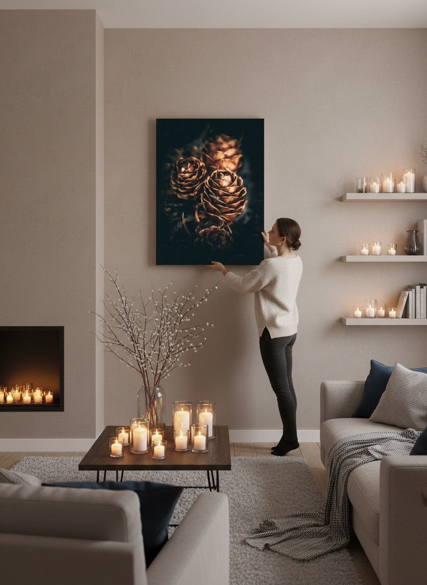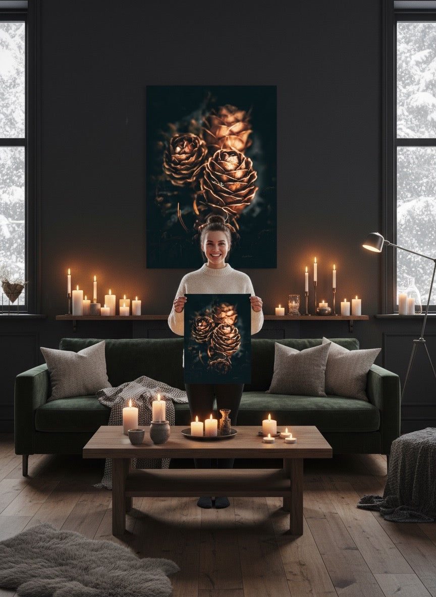 Nydelig kunstbilde av tre kongler som skinner så fint i gyldent lys. Fargene er vakre jordtoner og er veldig behagelige å se på. Dette veggbildet vil bli et flott smykke på veggen din. Det gir deg ro fra naturen, og vil imponere venner og familie. Få et nydelig kunstverk på veggen. Veggbildet passer spesielt godt på hytta.