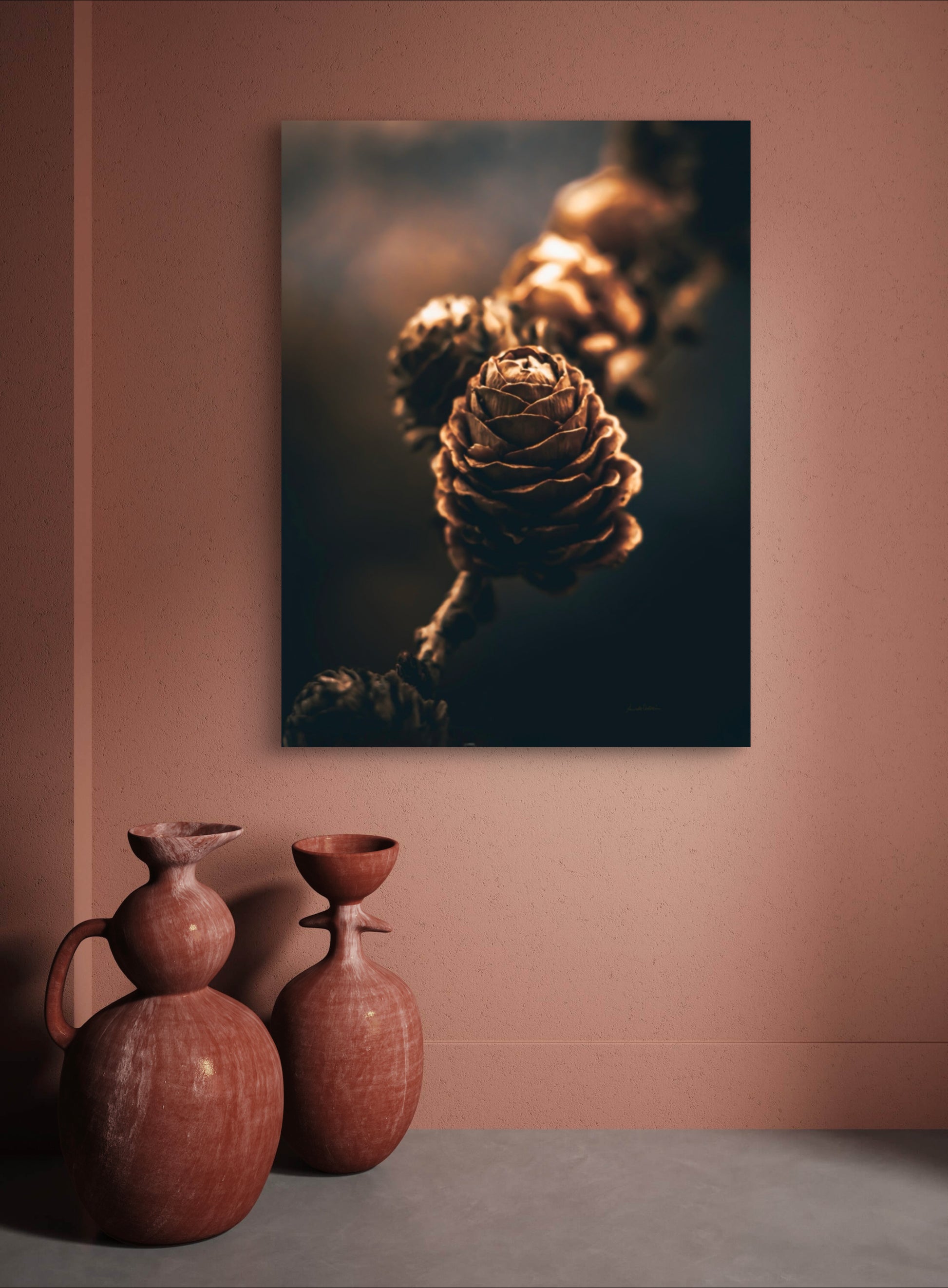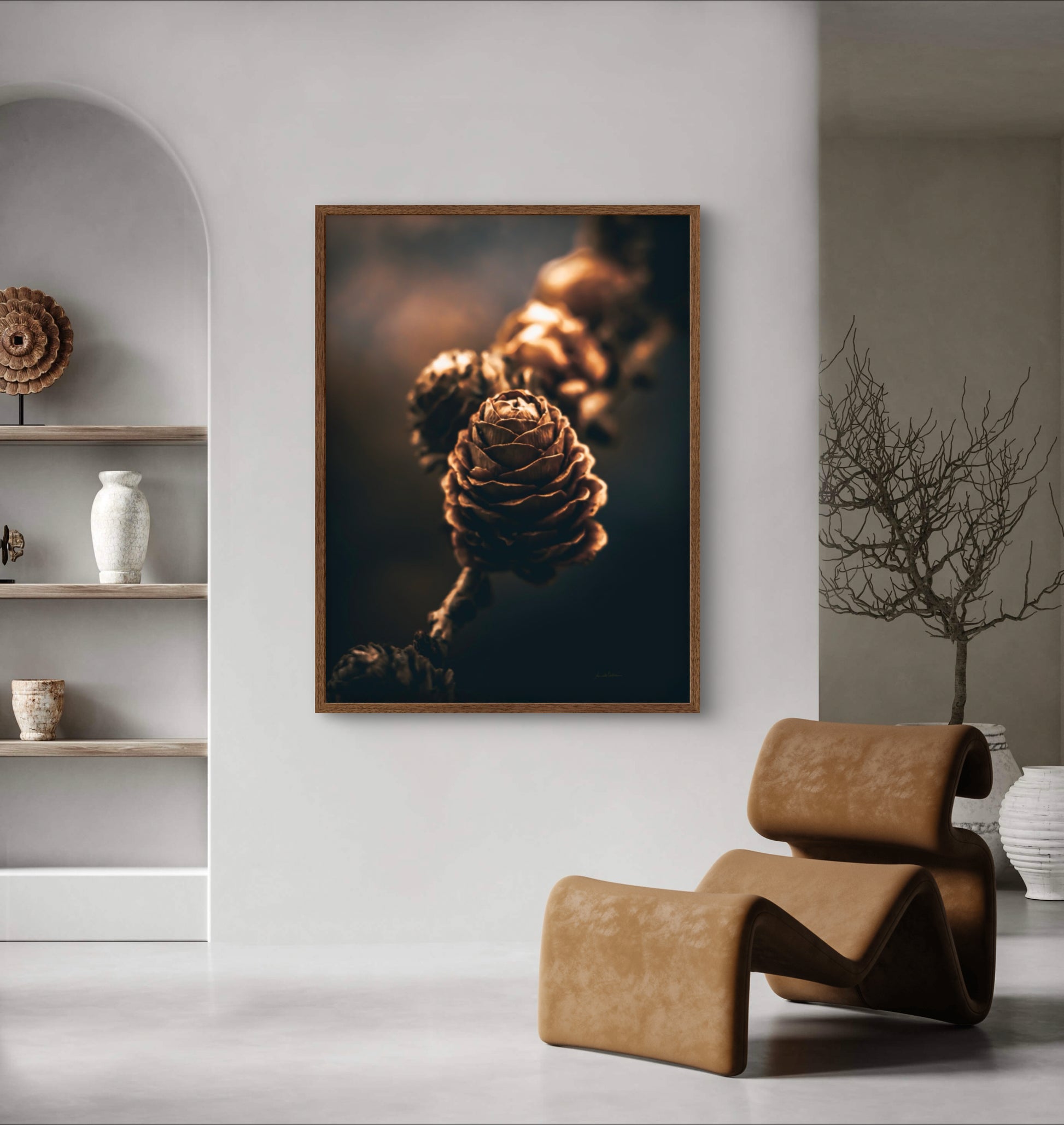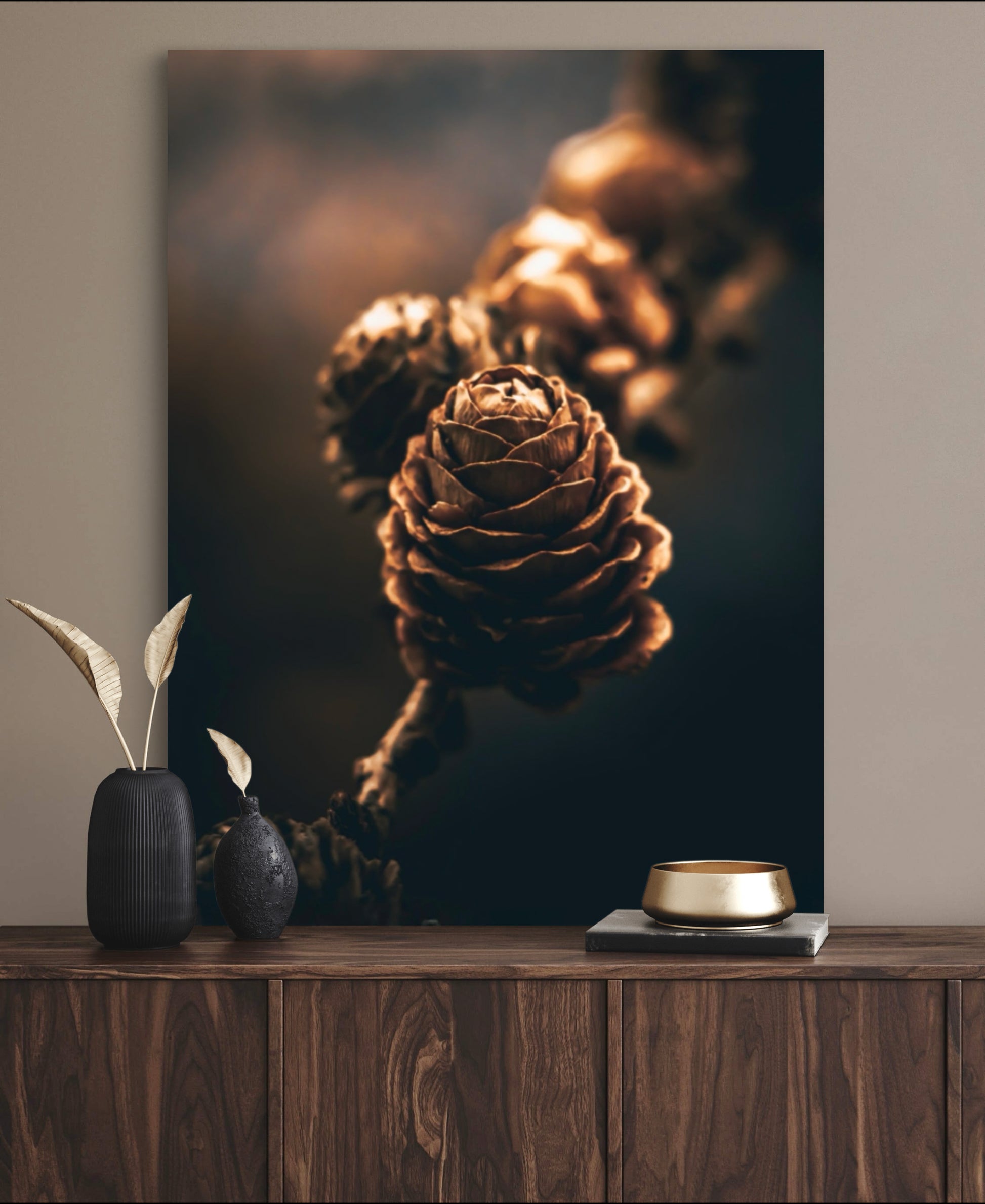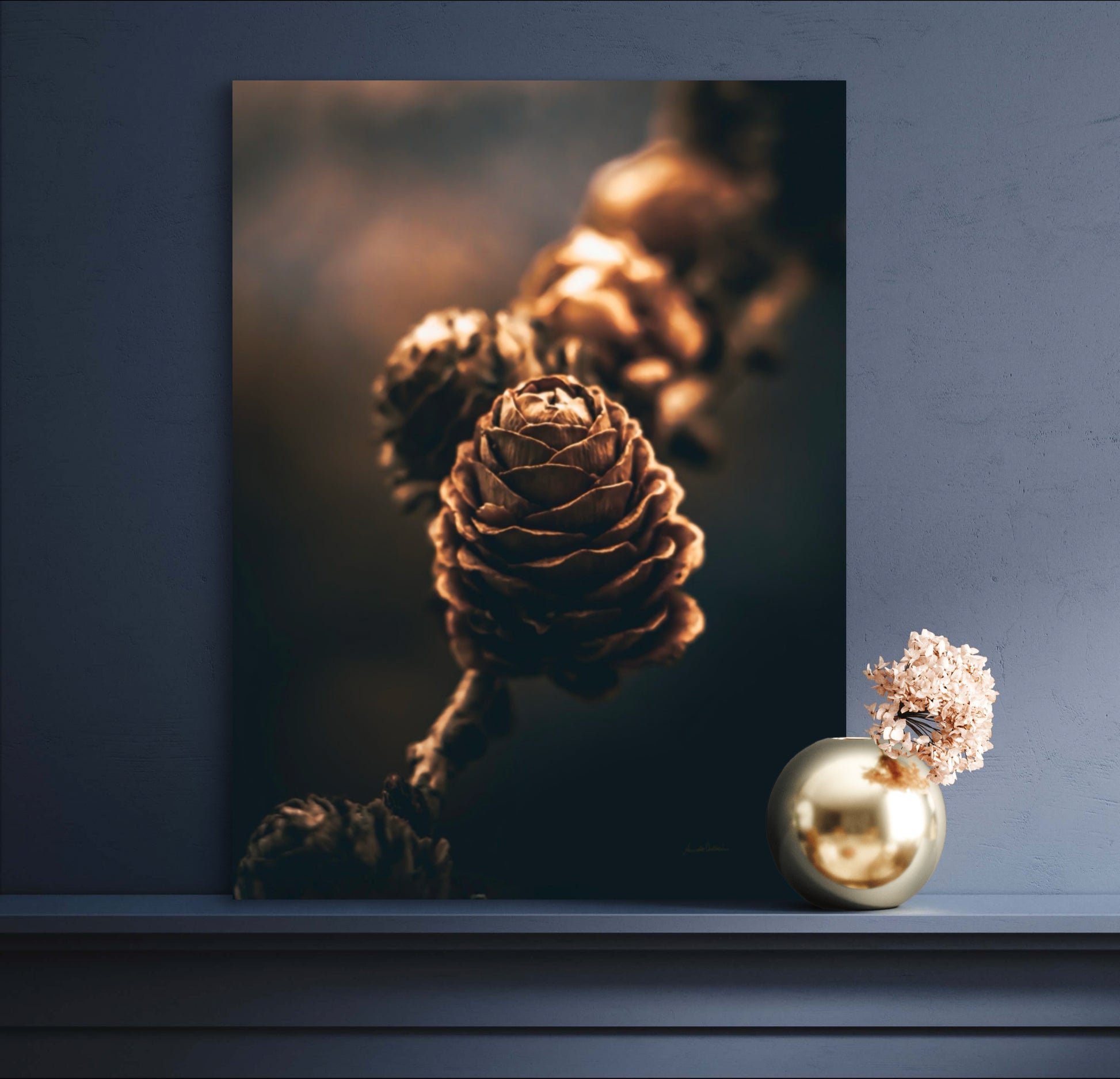 Nydelig og varmt fotografisk kunsbilde av lerkekongler på en gren i nydelige varme toner. Det er gull i naturen! Få et varmende og stemningsskapende bilde på veggen i dag du også.
