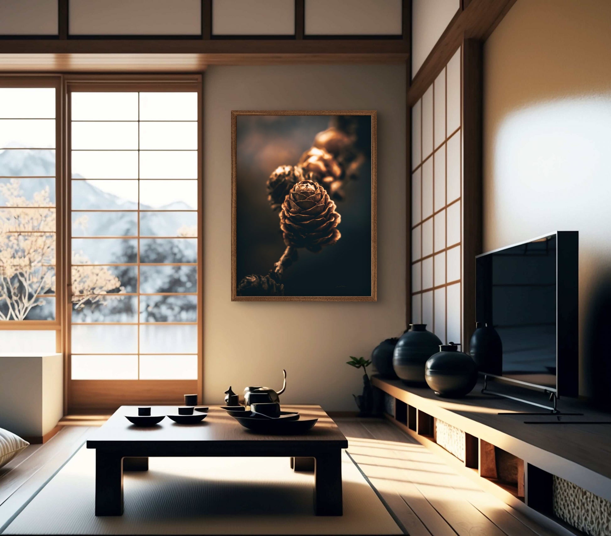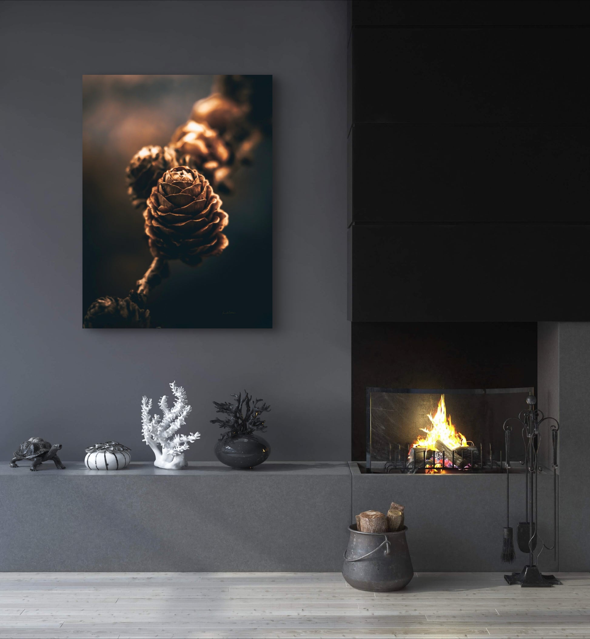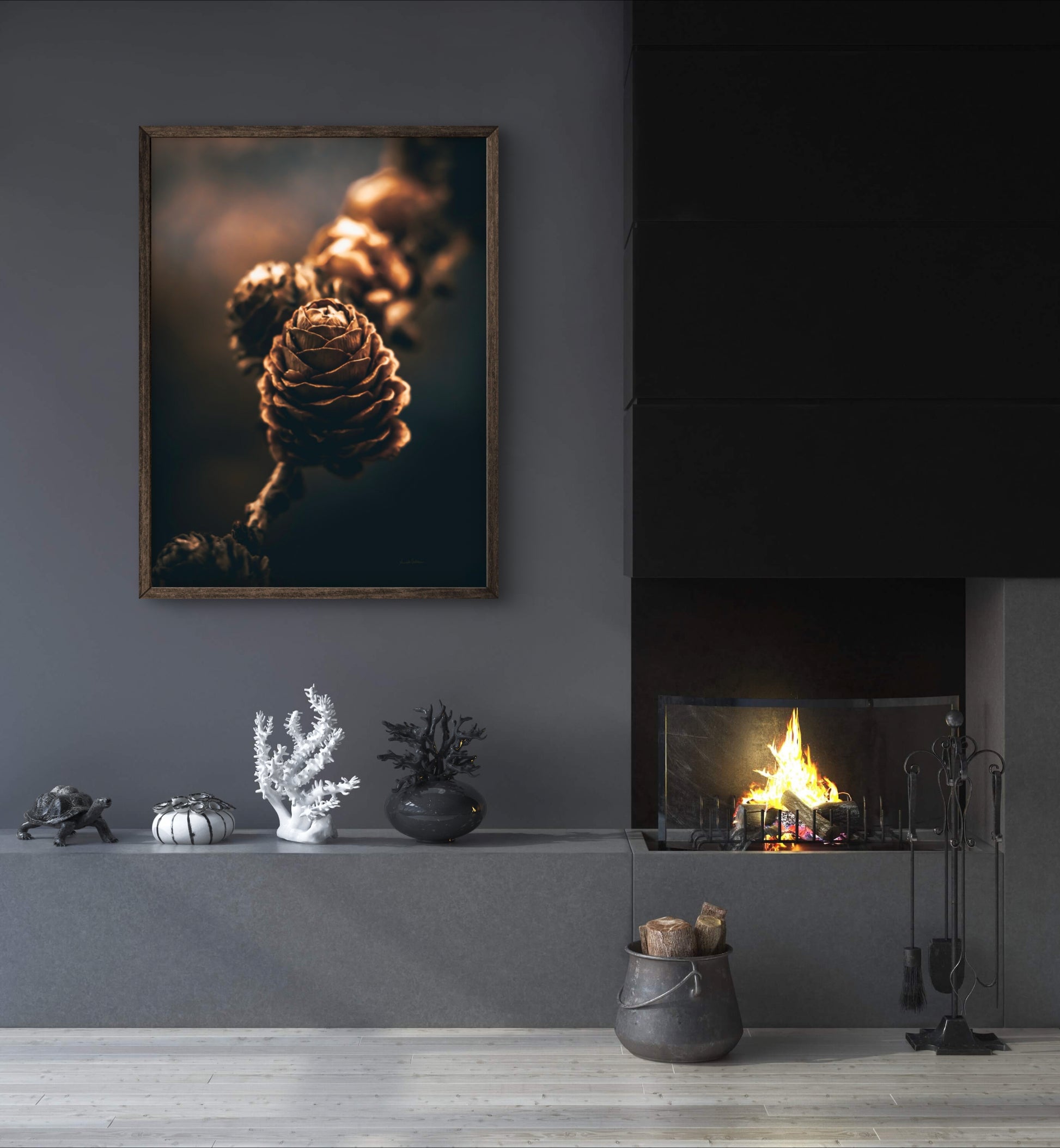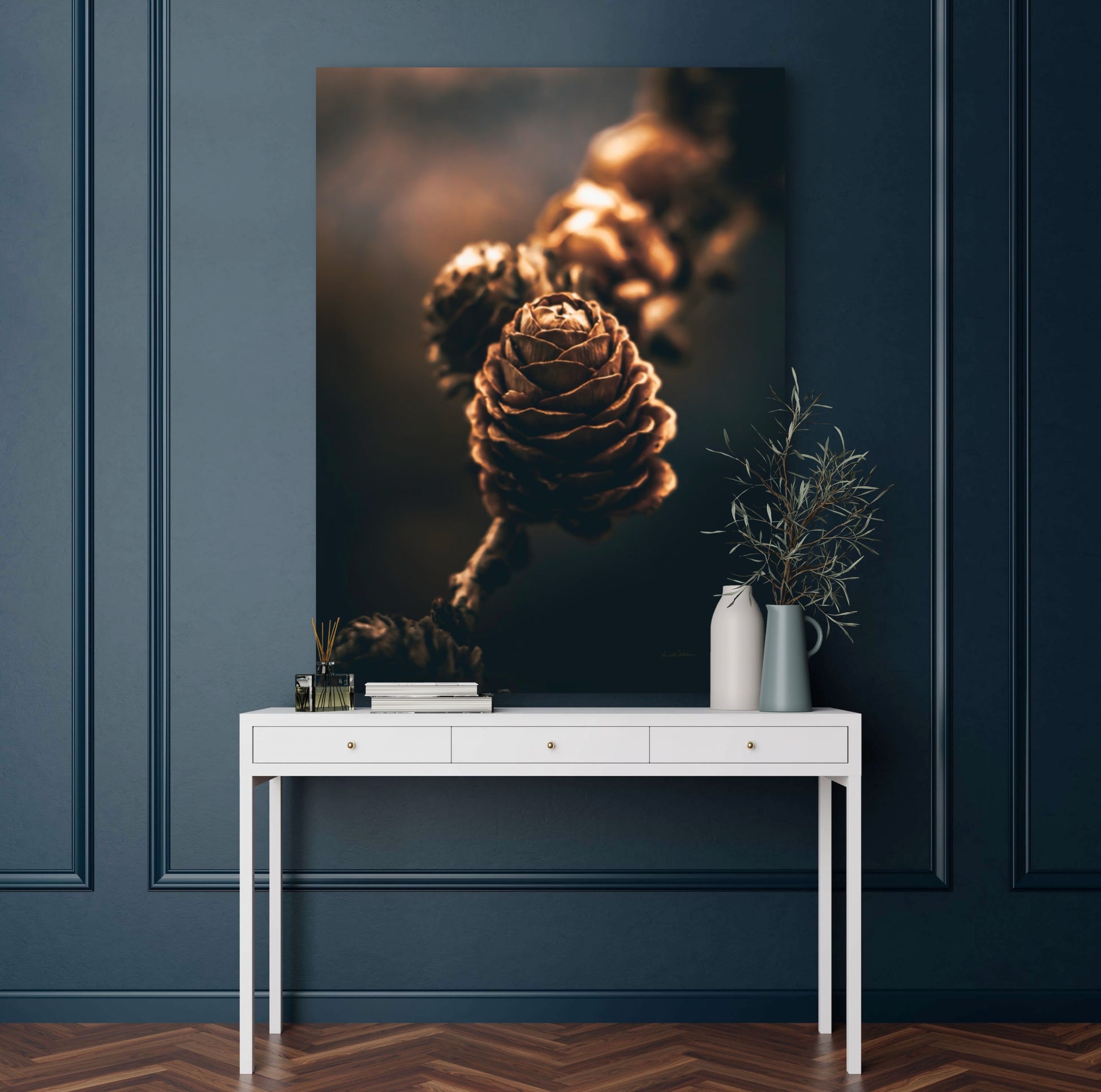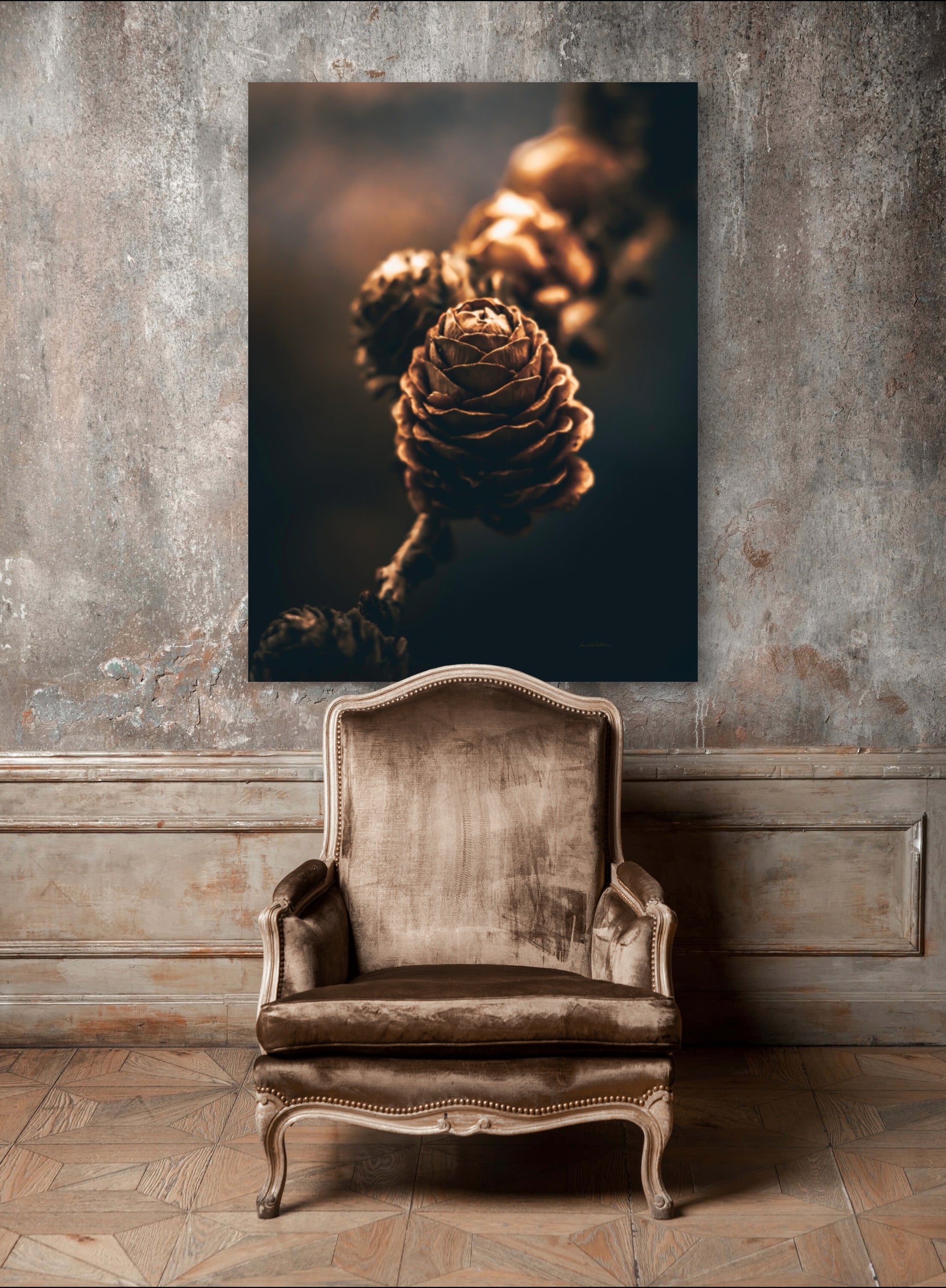 Nydelig og varmt fotografisk kunsbilde av lerkekongler på en gren i nydelige varme toner. Det er gull i naturen! Få et varmende og stemningsskapende bilde på veggen i dag du også.