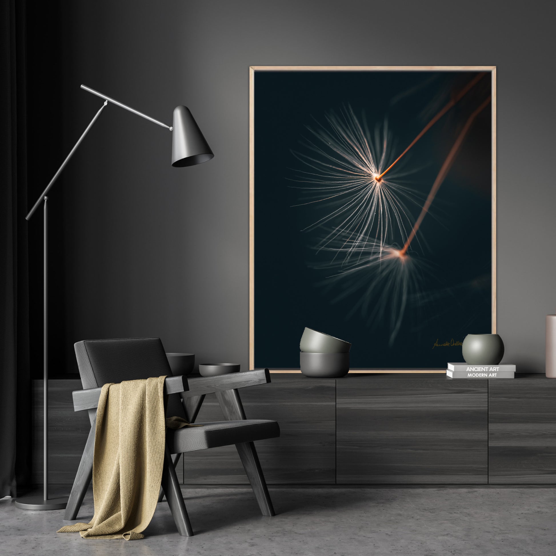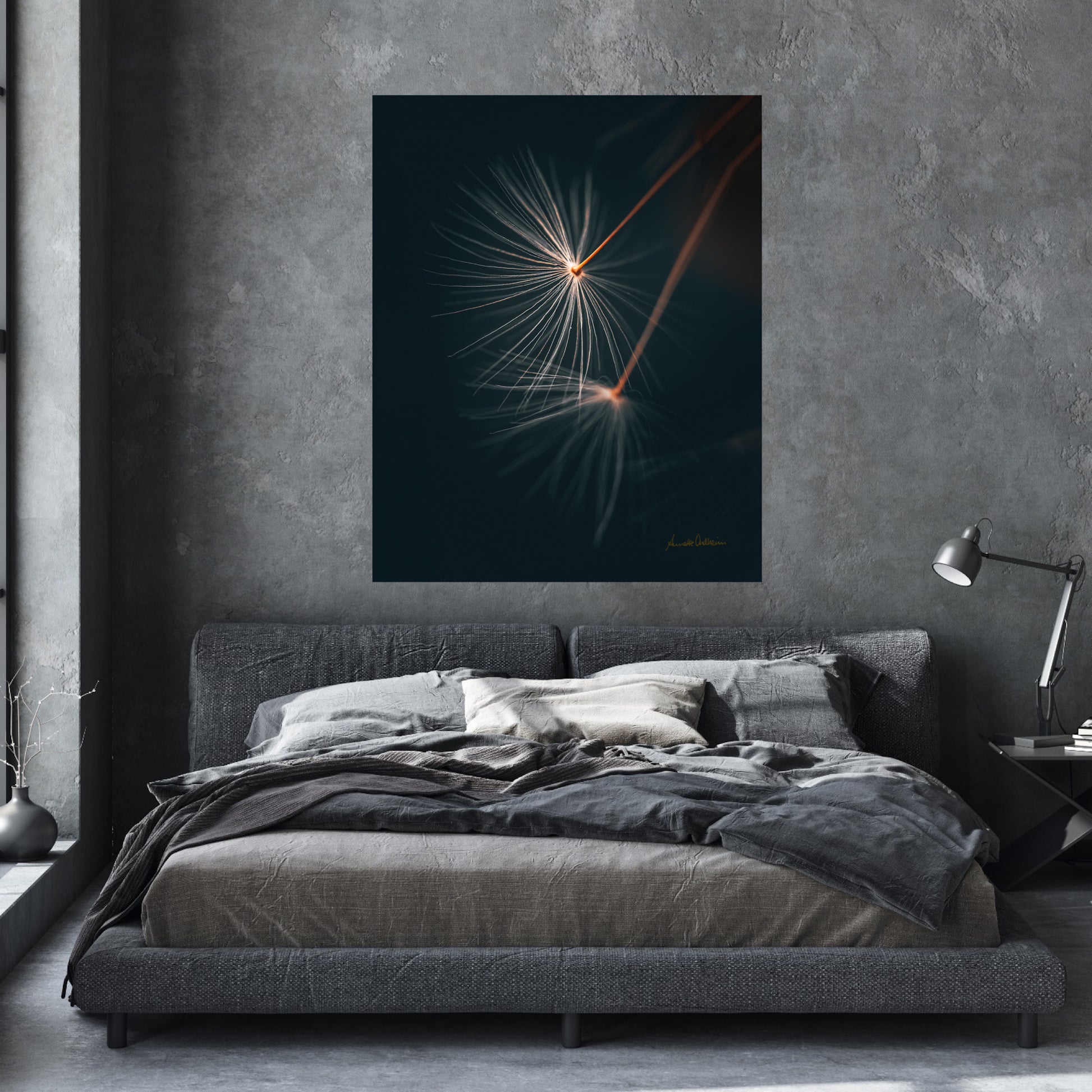 Vakker kunstplakat fra fotografi av et løvetannfrø i nydelig lys. Få et unikt kunstverk på veggen med dette bildet. La deg fascinere og inspirere av naturen og finn roen i ditt hjem med dette fine veggbildet.