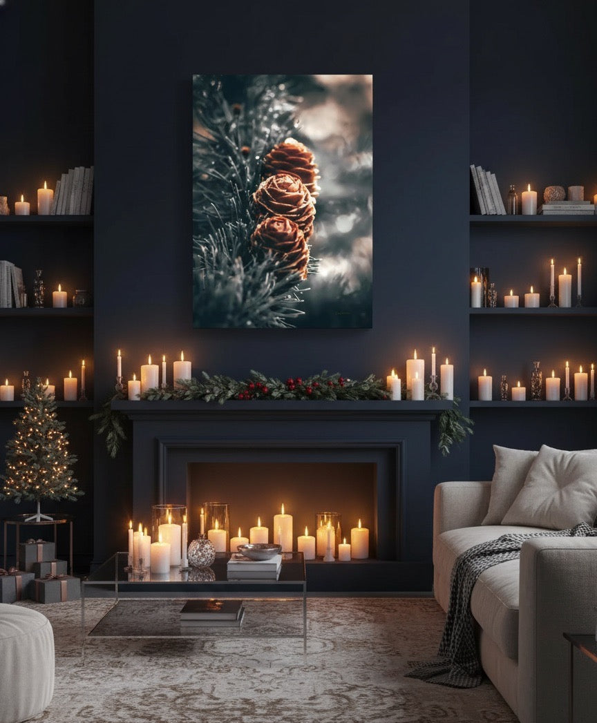 Vakkert kunstbilde av tre kongler på en gren med sollyset i bakgrunnet. Få et fint veggbilde med dette flotte motivet.