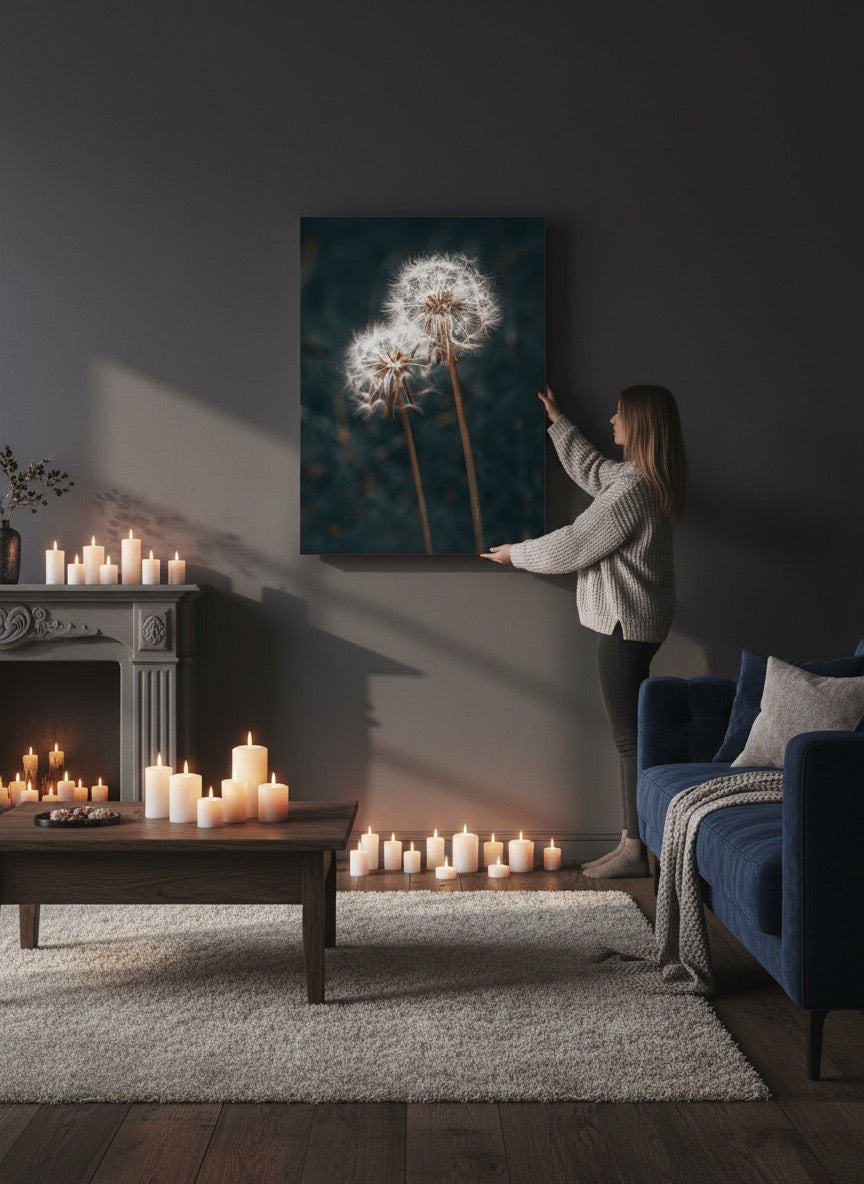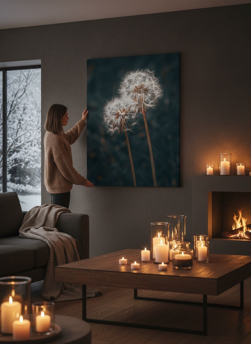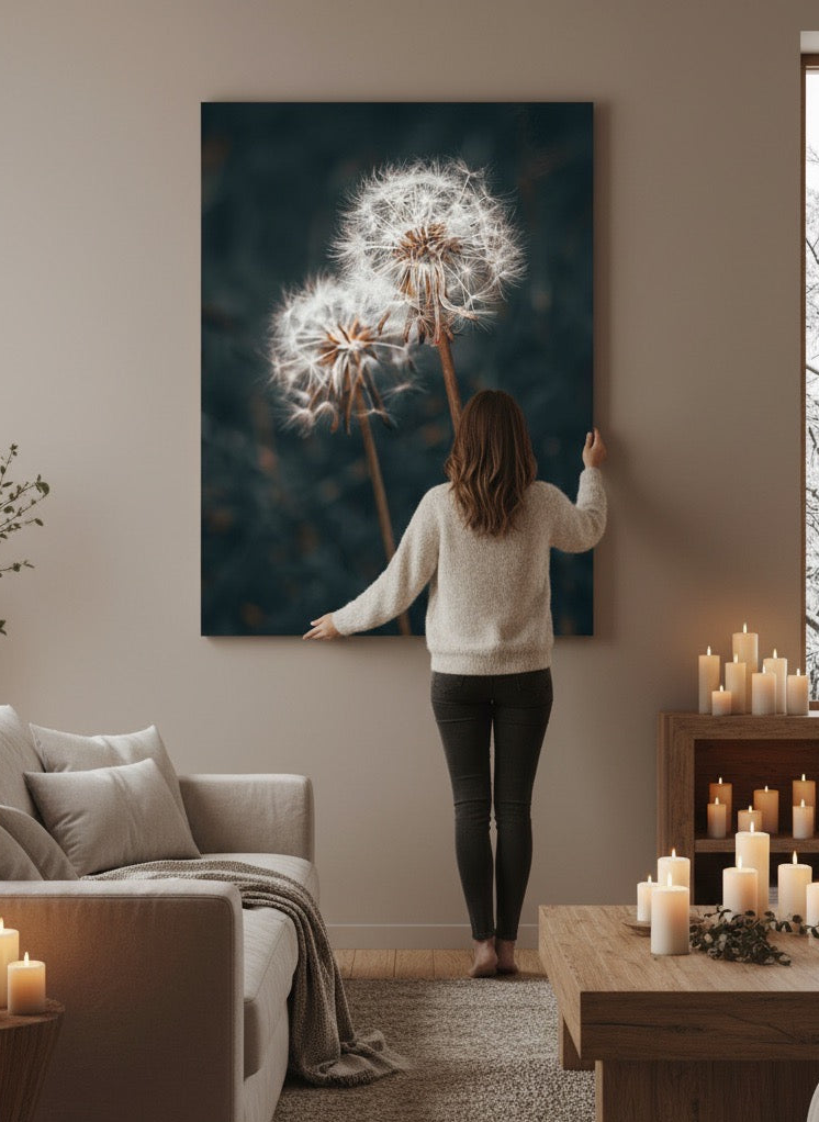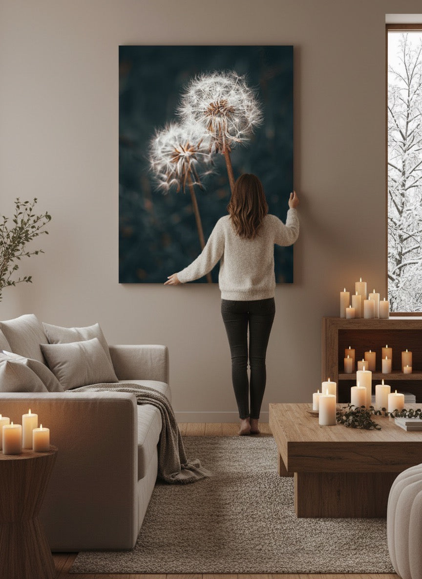 Nydelig vakkert kunstbilde av to løvetannfrø som lener seg mot hverandre. Kjenner du varmen og kjærligheten? Nydelig bilde som passer både på soverommet og i stua. Få et vakkert og følelsesladet bilde på veggen din i dag med dette nydelige motivet.