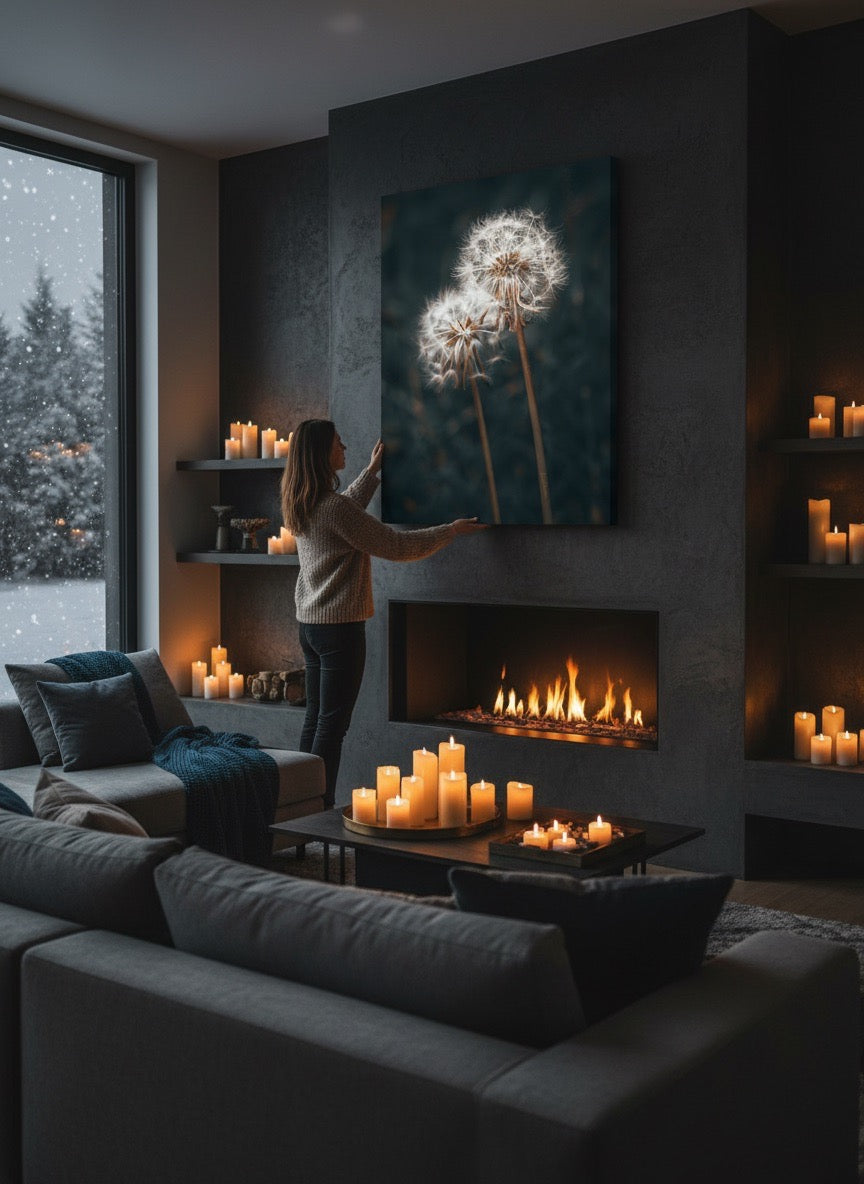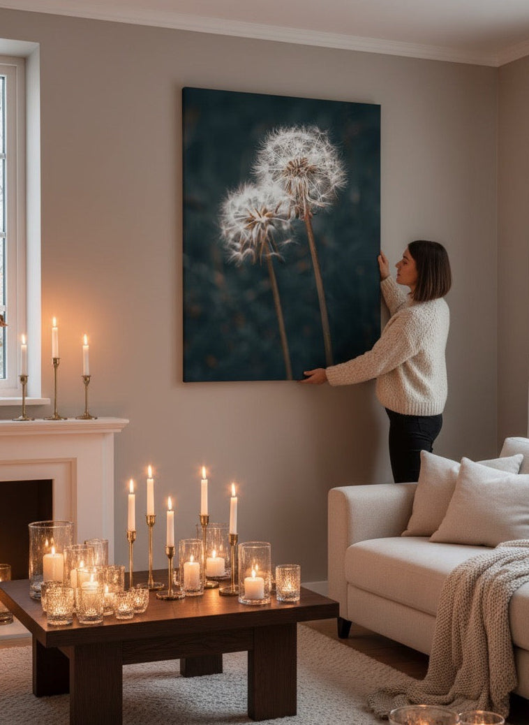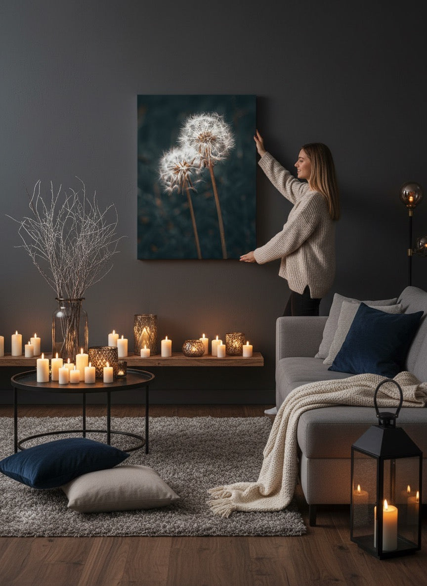 Nydelig vakkert kunstbilde av to løvetannfrø som lener seg mot hverandre. Kjenner du varmen og kjærligheten? Nydelig bilde som passer både på soverommet og i stua. Få et vakkert og følelsesladet bilde på veggen din i dag med dette nydelige motivet.