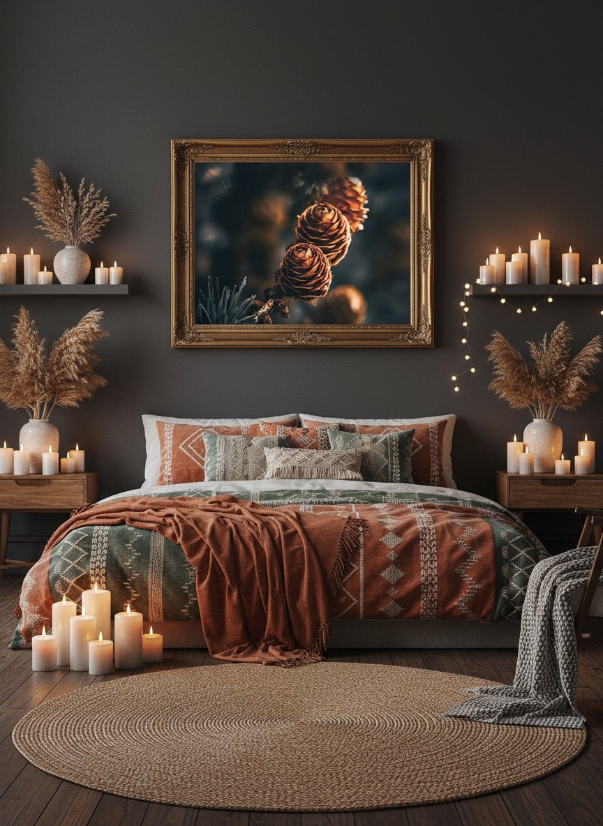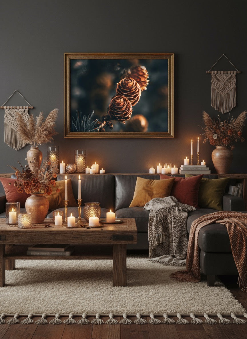 Nydelig kunstbilde av tre lerkekongler på en gren i vakre gyldne brune toner mot en gråblå bakgrunn. Nydelig kongler som gjør seg flott på veggen hos deg!